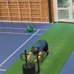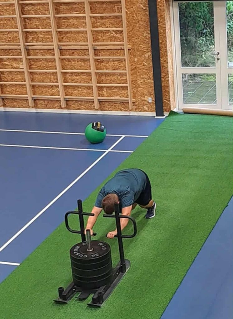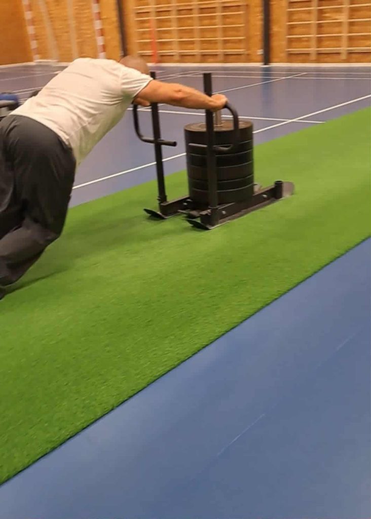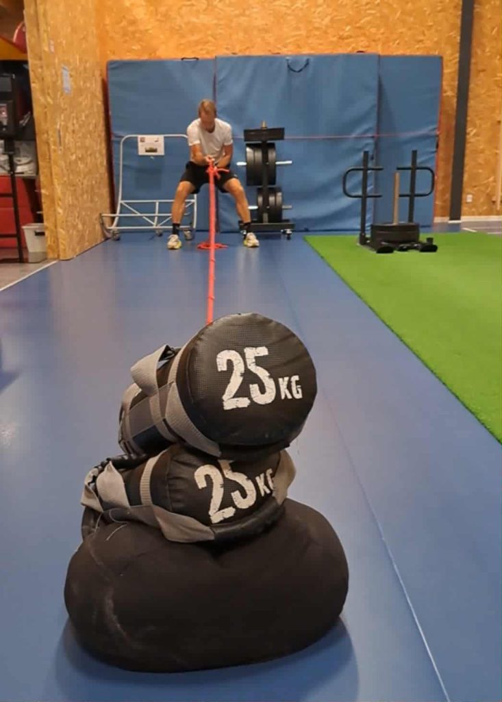 Her vil du møde Prowler-slæde:på enTurfbane, power bag, wall balls, speed ladder, kettlebells, slyngetræner mv.